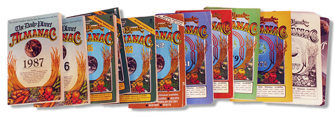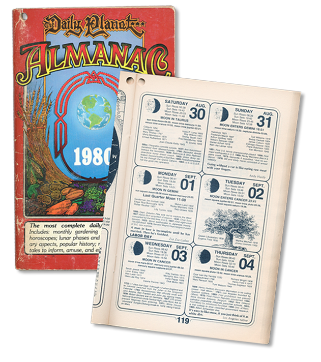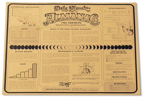 In 1976, The Daily Planet Almanac was launched through a group effort at an alternative school in California. The initial financial support came from Jerry Garcia and Bob Weir, who were acquainted with the school. This annual publication was an alternative to traditional almanacs, and included astronomical, astrological, and the phase of the moon for every day of the year. The first images for the moon phases were simple geometric circles with dark shading, a standard approach in calendars and almanacs for hundreds of years. In 1980, the simple moon symbols were replaced with detailed, accurate pen and ink drawings of the day-by-day phase changes visible to the naked eye, produced by staff member Kim Long. In 1981, the staff added display advertising in order to generate more income. To notify sponsors, we created a poster (folded for mailing) with appropriate information about the publication and ad rates. This advertising guide was the first appearance of the full sweep of moon phases and in a late night brainstorming moment, the initial idea for The Moon Calendar.