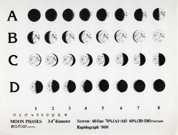 The Daily Planet Almanac ceased publication in 1982. Lots of fans, but it was expensive to produce and the original staff drifted on into other ventures ... except for Kim Long, who created the original moon artwork and continued the adventure of producing The Moon Calendar. Beginning with the Daily Planet Almanac, producing the Calendar involved “old-fashioned” systems linked to offset printing. This meant producing each year’s calendar at its full poster size, with each type and graphic element carefully cut out and pasted onto large sheets of acetate.